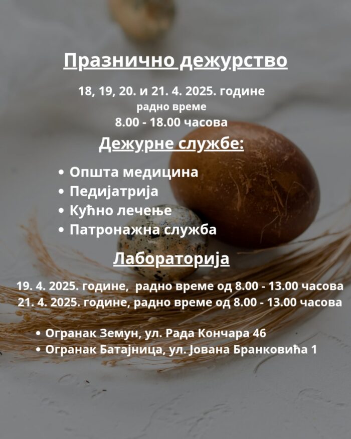 Током ускршњих празника, 18, 19, 20 и 21. априла од 8 до 18 часова у Дому здравља Земун (ул. Рада Кончара 46) и Огранак Батајница (ул. Јована Бранковића 1) биће дежурне службе: Општа медицина, Педијатрија, Кућно лечење и Патронажна служба.